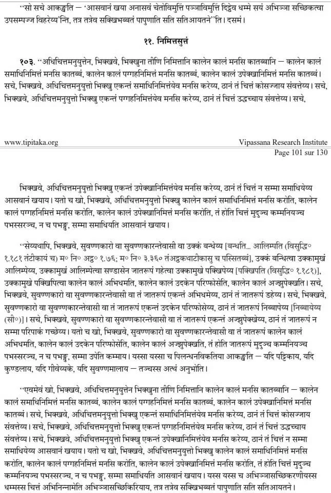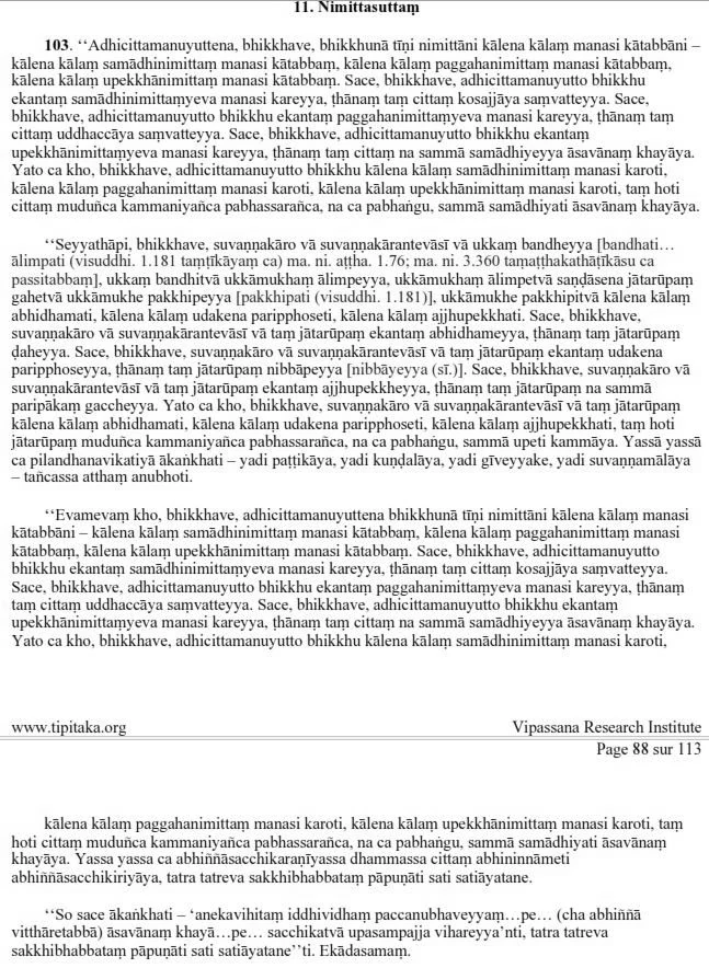 But if, from time to time, he gives attention to each of these three items, then his mind will be pliant, workable, lucid, and not unwieldy, and it will be well concentrated for the destruction of the taints(material desires).