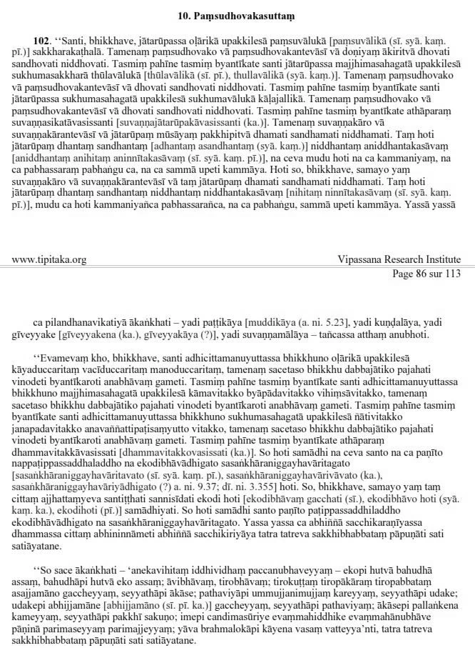 There are, O monks, gross impurities in gold, such as earth and sand, gravel and grit. Now the goldsmith or his apprentice first pours the gold into a trough and washes, rinses and cleans it thoroughly. When he has done this, there still remain moderate impurities in the gold, such as fine grit and coarse sand. Then the goldsmith or his apprentice washes, rinses and cleans it again. When he has done this, there still remain minute impurities in the gold, such as fine sand and black dust. Now the goldsmith or his apprentice repeats the washing, and thereafter only the gold dust remains.