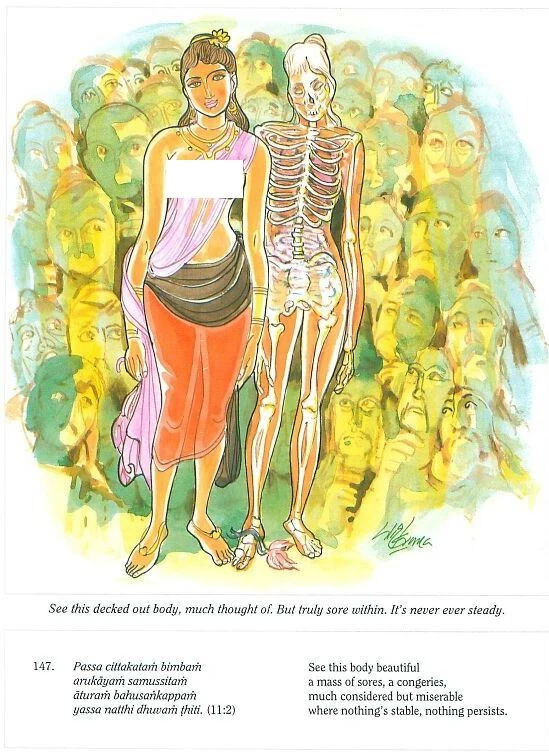 Verse 147: Look at this dressed up body, a mass of sores, supported (by bones), sickly, a subject of many thoughts (of sensual desire). Indeed, that body is neither permanent nor enduring.