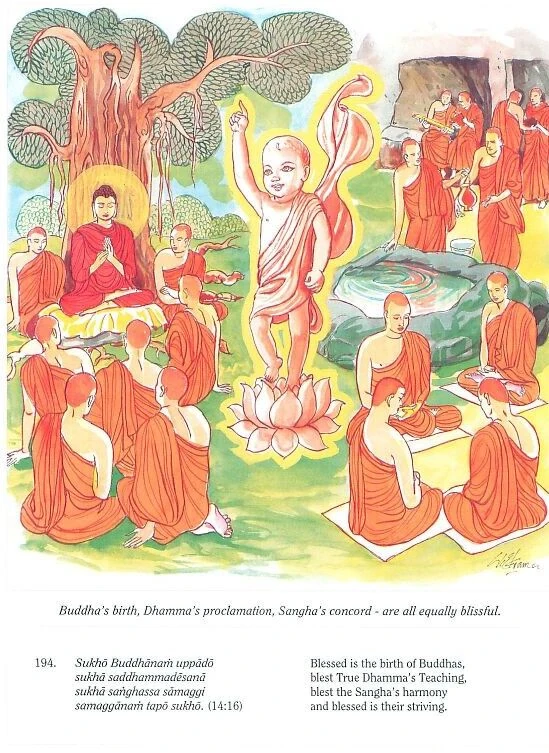 Verse 194: Happy is the arising of a Buddha; happy is the exposition of the Ariya Dhamma; happy is the harmony amongst the Samgha; happy is the practice of those in harmony.