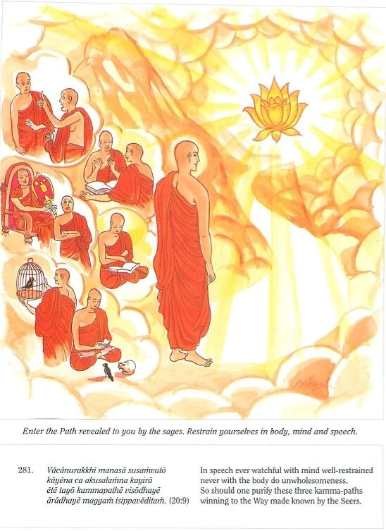 Verse 281: One should be careful in speech, be well-restrained in mind, and physically, too, one should do no evil. One should purify these three courses of action and accomplish the practice of the Path of Eight Constituents made known by the Buddhas.