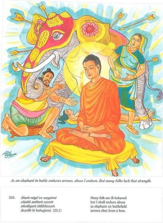Verse 320: As an elephant in battlefield withstands the arrow shot from a bow, so shall I endure abuse. Indeed, many people are without morality.