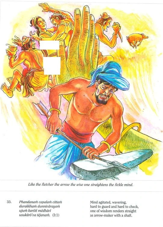In the Dhammapada there are several references to the craftsmanship of the fletcher. The Buddha seems to have observed the process through which a fletcher transforms an ordinary stick into an efficient arrow-shaft. The disciplining of the mind is seen as being a parallel process. In this stanza the Buddha says that the wise one straightens and steadies the vacillating mind that is difficult to guard, like a fletcher straightening an arrow-shaft.