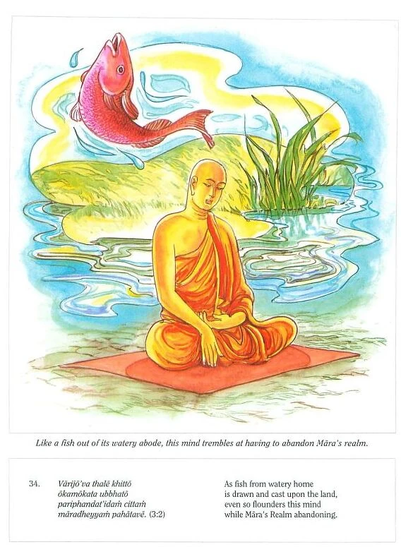 Verse 34: As a fish quivers when taken out of its watery home and thrown on to dry ground, so does the mind quiver when it is taken out of the sensual world to escape from the realm of Mara (i.e., kilesa vatta, round of moral defilements).