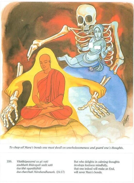 Verse 350: A man who takes delight in calming (sensual) thoughts, who is ever mindful, and meditates on the impurity (of the body, etc.) will certainly get rid (of craving); this man will cut the bond of Mara.