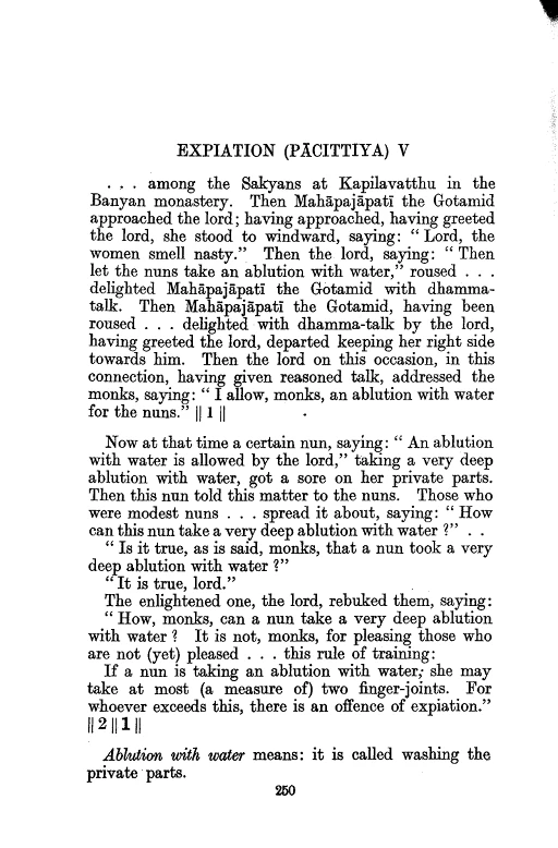 5. A bhikkhuni intending to wash should obtain water from the vessel up to the height of two inches, if she exceeds that, it's an offence that merit atonement.