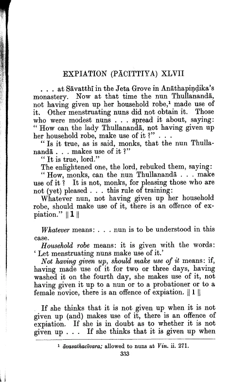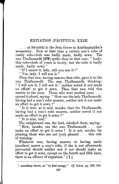 23 If a bhikkhuni un -pick the sewn stitches of a robe and leave it aside for four or five days without sewing it, and without making an effort to get it sewn, it's an offence for atonement.