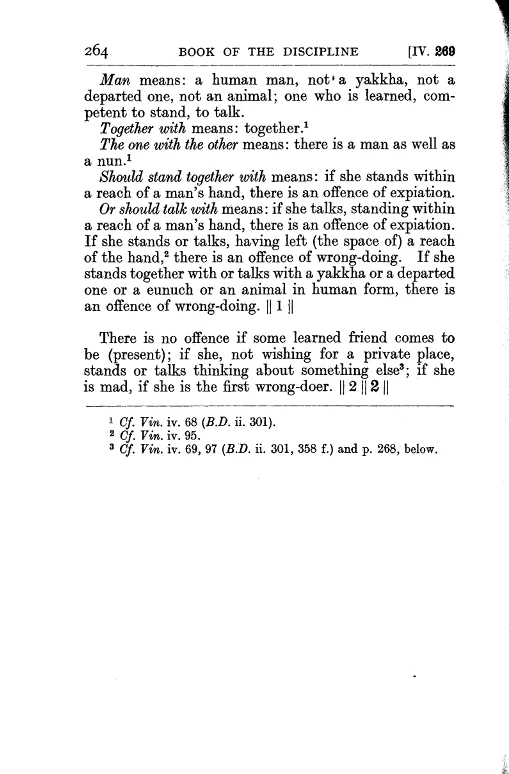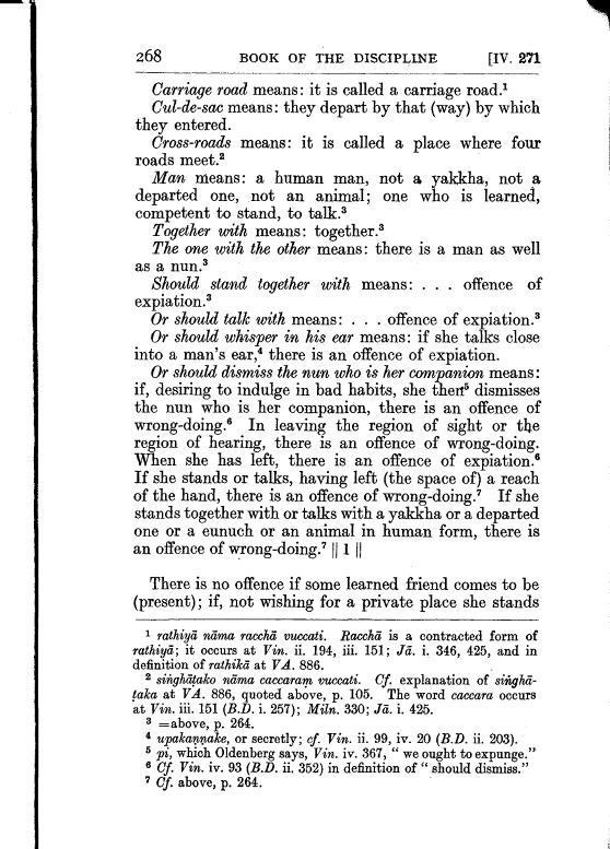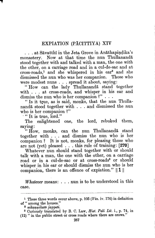 14. If a bhikkhuni without another, stand close to a male and talk to him, or whisper in the ear, on the public road, in an arranged place, or at the crossroads or send away the accompanying bhikkhuni, it is an offence for atonement.