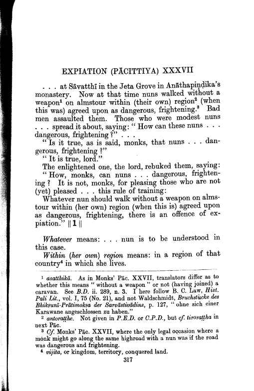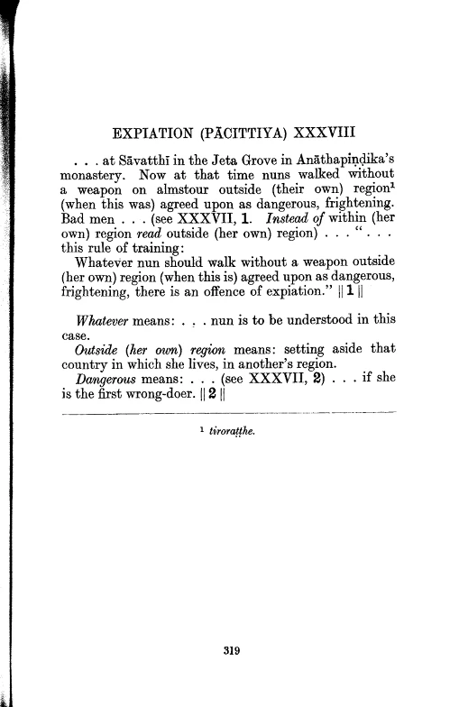37. A bhikkhuni going on a tour in a region considered dangerous and fearful within the country unprotected, is an offence for atonement.