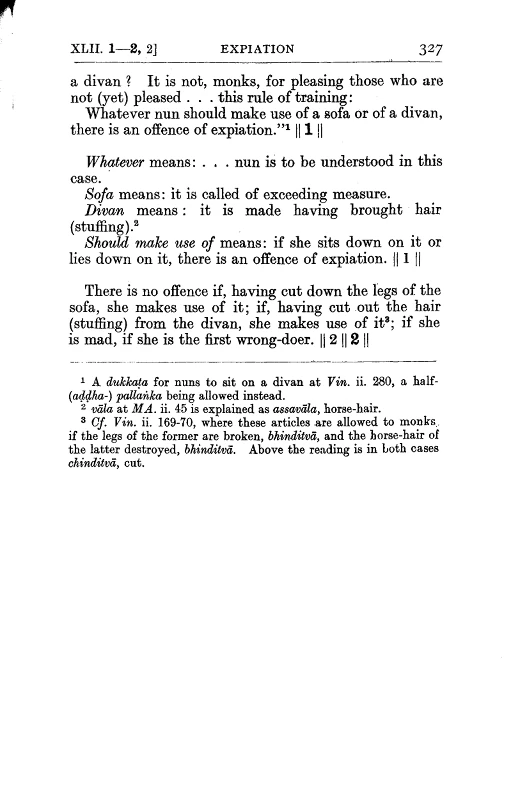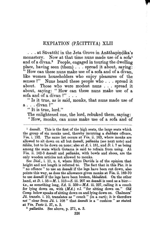 163. A bhikkhuni making a new, bed or chair, should make it to the height of eight finger lengths of the Well Gone One, ignoring the stand at the bottom. If the height exceeds, it's an offence for atonement, when it breaks up.