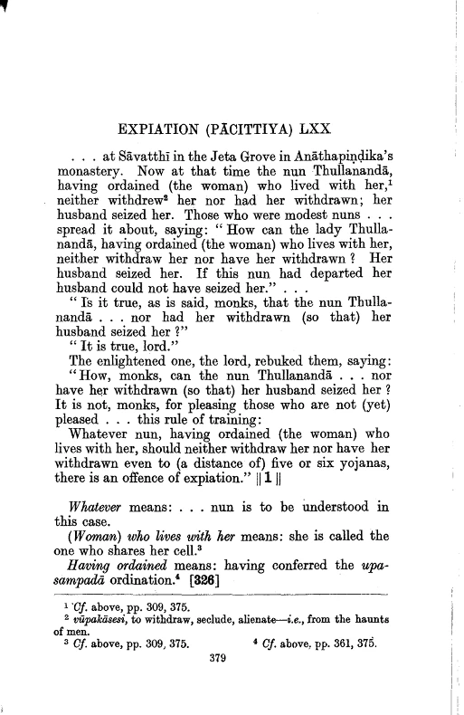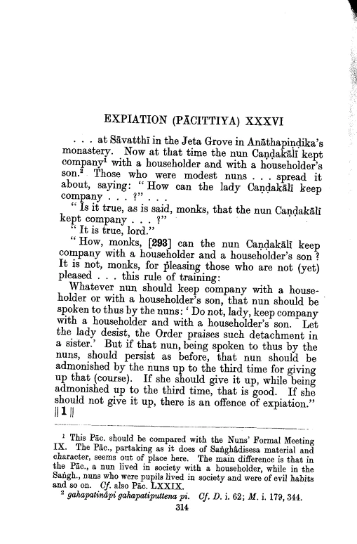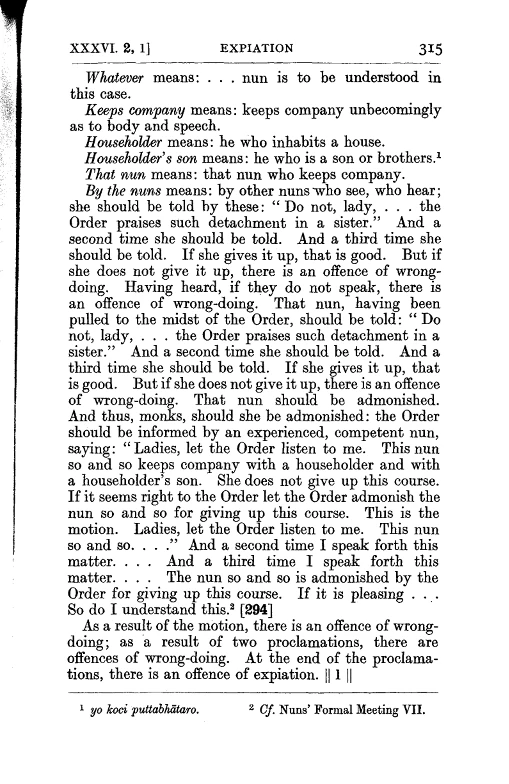 36. A bhikkhuni associating a householder, or a householder's son, should be admonished by the bhikkhunis: `Noble lady, do not associate a householder or the son of a householder. Live secluded. The Community of bhikkhunis praise seclusion.' If the bhikkhuni pursues that behavior when admonished, she should be admonished up to the third time. Good, if she give up the association, if not, it's an offence for atonement.