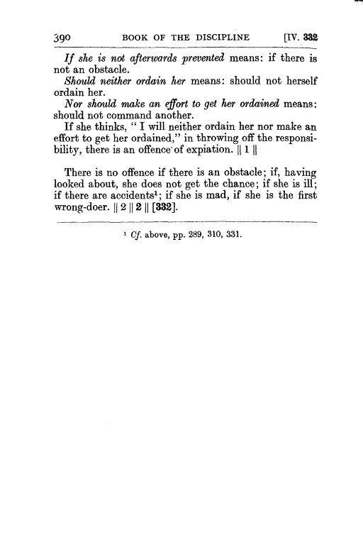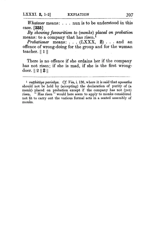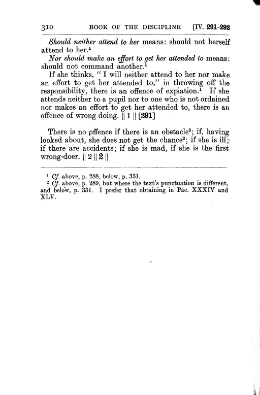 151. When the rules of the higher order are recited fortnightly if a bhikkhuni says:' Noble ladies, now I know, this gets included in the discourses.' She had been seen by the other bnhikkhunis listening to the recitation of the rules of the higher order, two or three times, undoubtedly even more. It is not possible that she could get free expressing not knowing. If she had done an offence, she should be dealt accordingly for it and for hiding in delusion: `Noble lady, it is no gain for you, it's a rare chance you get to listen to the recitation of the rules of the higher order attentively.' That delusion is an offence for atonement.