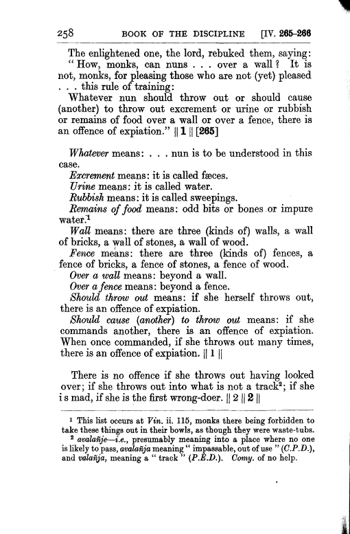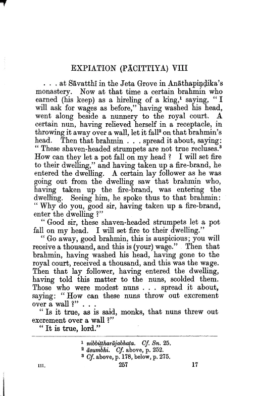 8. If a bhikkhuni throws excrement, urine, rubbish or stale food, over a wall or fence, or make another to do it for her, she does an offence that merit atonement.