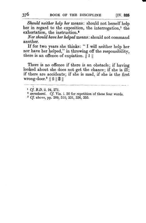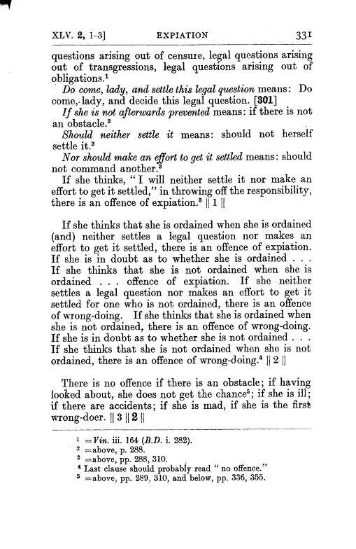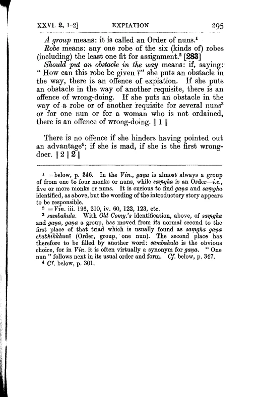146. If a bhikkhuni says, as I understand the Teaching preached by the Blessed One. `The things that are said to be obstructions by the Blessed One are not real obstructions to one who indulges in them.' She should be admonished by the bhikkhunis: `Noble lady, do not say that, do not misinterpret the words of the Blessed One, it's not good to misinterpret the Teaching. The Blessed One did not say it. The Blessed One has explained in various ways, that the obstructing things are dangerous and indeed those who indulge in them fall into trouble.' If the bhikkhuni pursues with the view when admonished, she should be admonished up to the third time. When admonished up to the third time, good, if she gives up that view. If not, it's an offence for atonement.