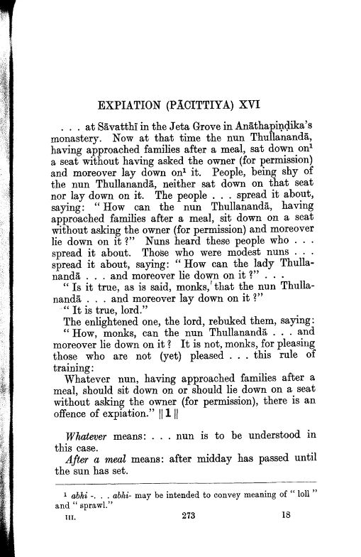 16.If a bhikkhuni approaches a family after the mid-day meal, take a seat uninvited, or dose off there, it's an offence for atonement.