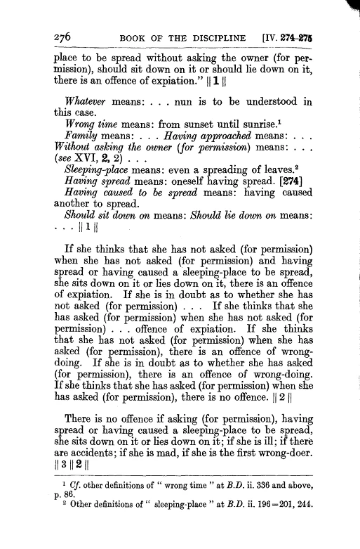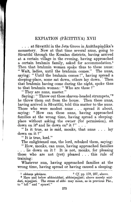 17 If a bhikkhuni approach a family untimely, spread a cover, and either sit or sleep there, without the permission of the mistress, it's an offence for atonement.