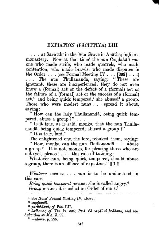 153. If a bhikkhuni angry and displeased raises the palm with the gesture of hitting a bhikkhuni, it's an offence for atonement.