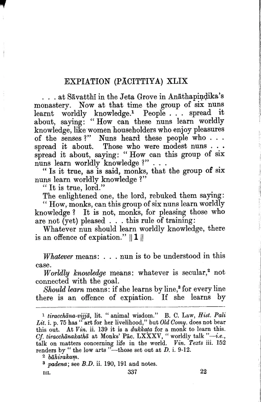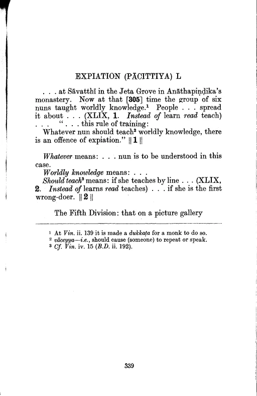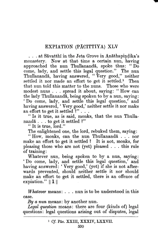 149. Should a bhikkhuni say thus to something told rightfully by the bhikkhunis: `Noble ladies, I will not observe this precept until I get it explained by a learned disciplinarian.' It's an offence for atonement.
