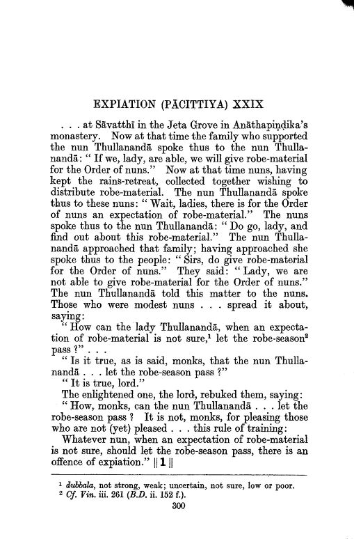 29. If a bhikkhuni let the robe season pass owing to weak expectations of robe material, it's an offence for atonement.