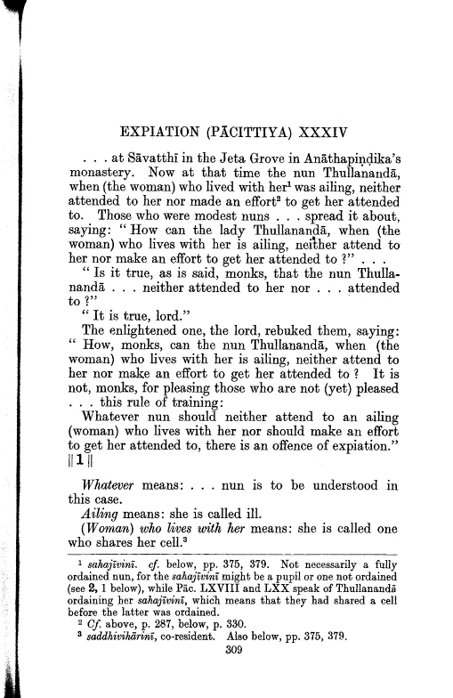 34. A bhikkhuni not attending or making another attend on an ailing woman living with her, it's an offence for atonement.