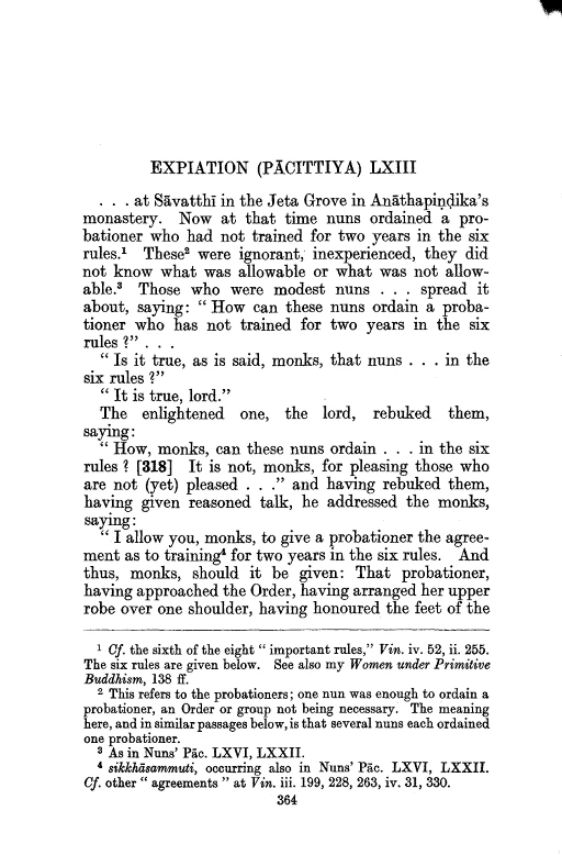 148. Even a novice says:' The things that are said to be obstructions by the Blessed One are not real obstructions to one who indulges in them.' The novice should be admonished by the bhikkhunis: `Noble lady, the Blessed One did not say that, do not misinterpret the words of the Blessed One.It's not good to misinterpret the Teaching. The Blessed One did not say it. The Blessed One has explained in various ways, that the obstructing things are dangerous and indeed those who indulge in them fall into trouble.' If the novice pursues with the view when admonished by the bhikkhunis this should be said: `Noble lady, from today, the Blessed One is not your Teacher, I stand witness for that. Other novices are favored and could live with the bhikkhunis