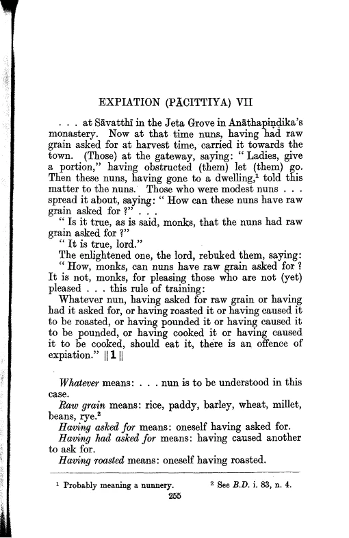 7. If a bhikkhuni begs for raw grains, roast it, pound it, or cook it and eat it, or make another to do it for her and eat it, it's an offence that merit atonement.