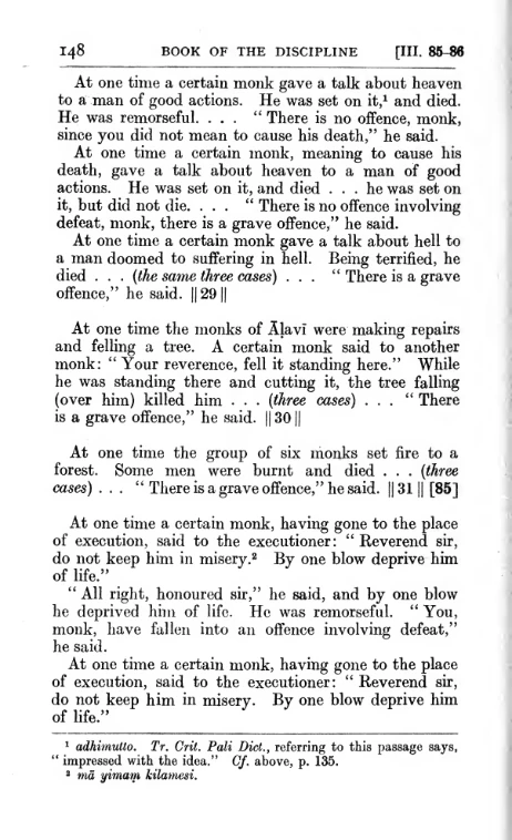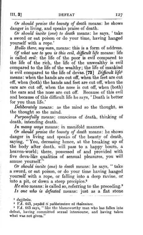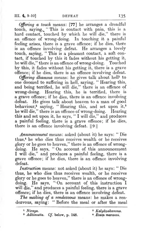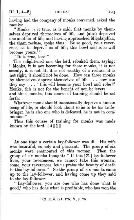 3. Should any bhikkhu intentionally deprive a human being of life, or search for an assassin for him, or praise the advantages of death, or incite him to die (saying,): "My good man, what use is this evil, miserable life to you? Death would be better for you than life," or with such an idea in mind, such a purpose in mind, should in various ways praise the advantages of death or incite him to die, he also is defeated and no longer in affiliation.