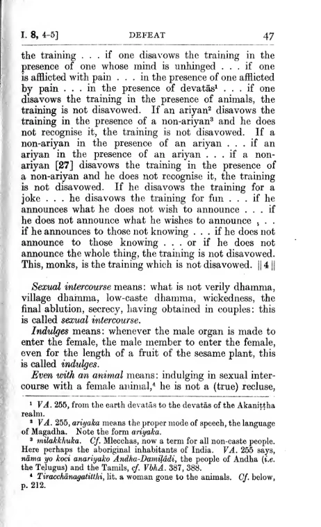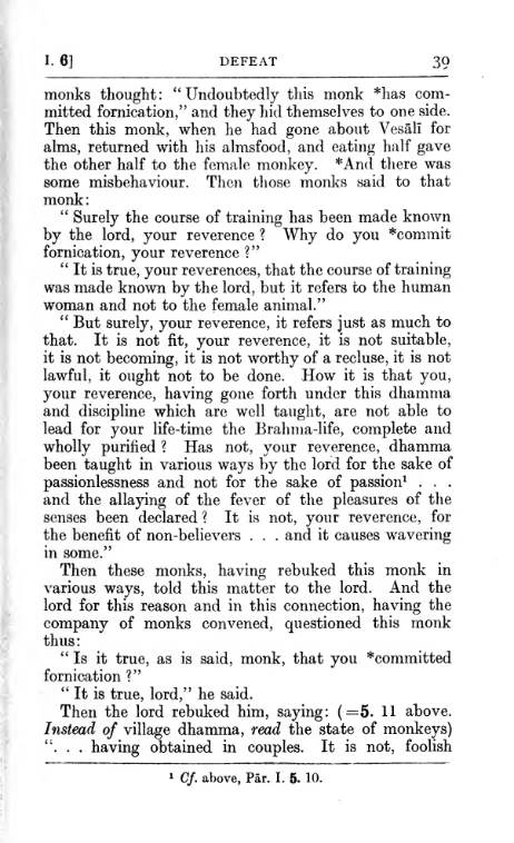 1. Should any bhikkhu — participating in the training and livelihood of the bhikkhus, without having renounced the training, without having declared his weakness — engage in sexual intercourse, even with a female animal, he is defeated and no longer in affiliation.