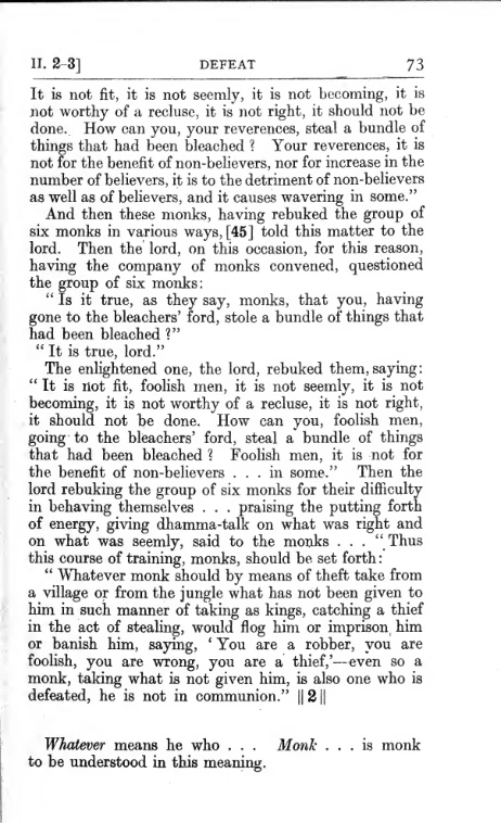 2. Should any bhikkhu, in what is reckoned a theft, take what is not given from an inhabited area or from the wilderness — just as when, in the taking of what is not given, kings arresting the criminal would flog, imprison, or banish him, saying, "You are a robber, you are a fool, you are benighted, you are a thief" — a bhikkhu in the same way taking what is not given also is defeated and no longer in affiliation.