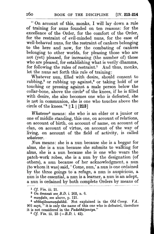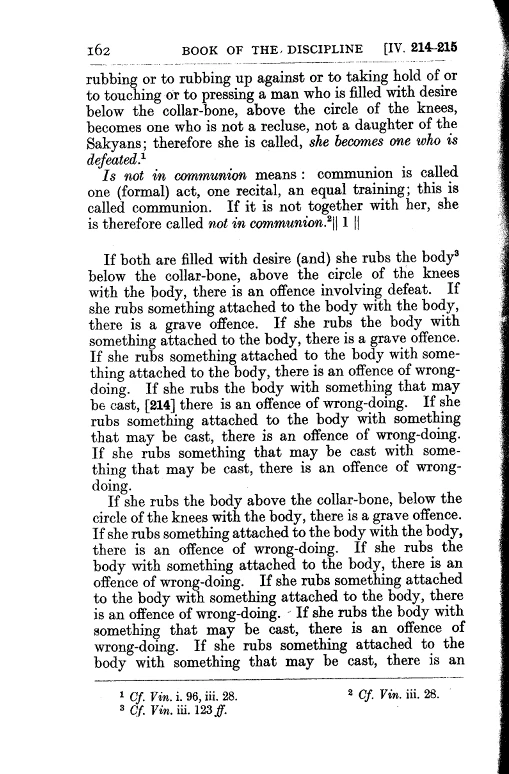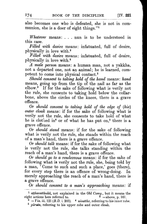 5 If a bhikkhuni with desire consents to a male person's approach to brush up or down, or massage, or take hold, or touch or press above the knee caps, is an offence fit to be ex-communicated.