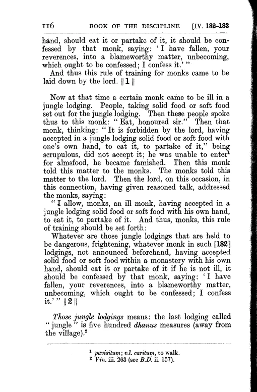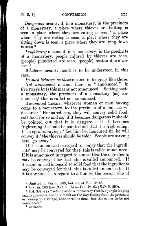 4. There are wilderness lodgings that are considered dubious and risky. Should any bhikkhu, not being ill, living in such lodgings, chew or consume (a gift of) staple or non-staple food that was unannounced beforehand, having received it with his own hand in the lodging, he is to acknowledge it: "Friends, I have committed a blameworthy, unsuitable act that ought to be acknowledged. I acknowledge it."