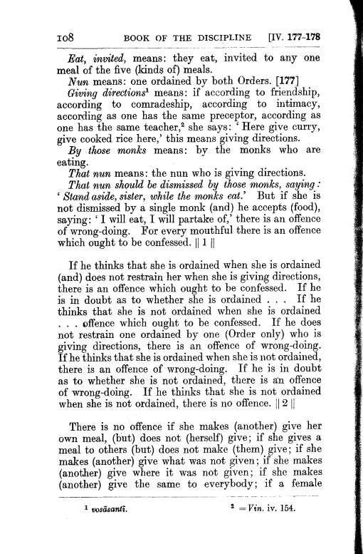 2. In case bhikkhus, being invited, are eating in family residences, and if a bhikkhuni is standing there as though giving directions, (saying,) "Give curry here, give rice here," then the bhikkhus are to dismiss her: "Go away, sister, while the bhikkhus are eating." If not one of the bhikkhus should speak to dismiss her, "Go away, sister, while the bhikkhus are eating," the bhikkhus are to acknowledge it: "Friends, we have committed a blameworthy, unsuitable act that ought to be acknowledged. We acknowledge it."